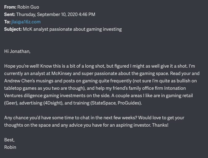 What brought me to California and a16z was my passion for gaming, but what I learned here is that it makes it easy to miss the forest for the trees if you’re too passionate. It can lead you astray, blind you to reality. Gaming is a great industry and I thoroughly enjoyed my time there, but I didn’t accept the truth that it’s going through a long bear market because of how capital intensive it is, how oversupplied it is, and how much demand there is for consumer attention. The structure of the market makes it much more challenging (but not impossible) to be great.